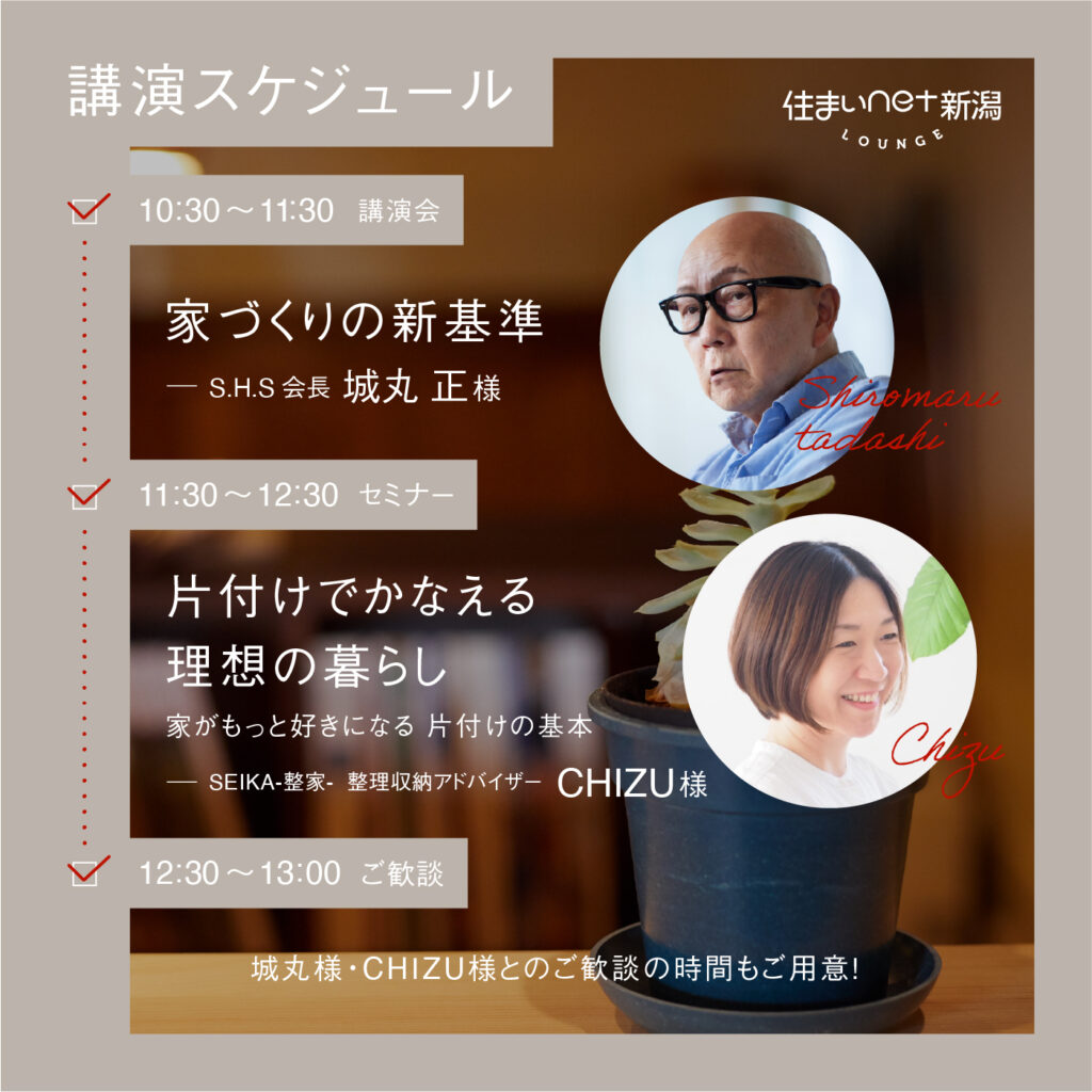 ラウンジの雰囲気を感じていただきながら、S.H.S 会長の城丸 正さん、整理収納アドバイザー SEIKA-整家-のCHIZUさんによる、「家づくり」や「暮らしの楽しみ方」を学べる特別なイベントを開催。